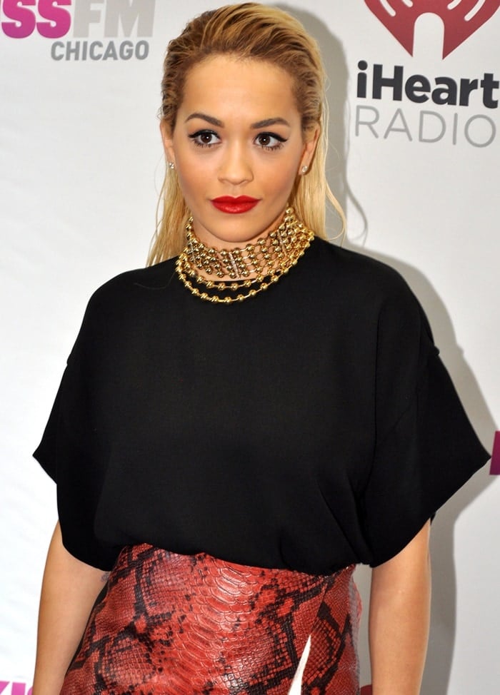 Rita Ora’s signature red lip and slicked-back hair only added to the chic effect at 103.5 KISS FM’s Jingle Ball held at the Allstate Arena in Rosemont, Illinois, on December 18, 2014