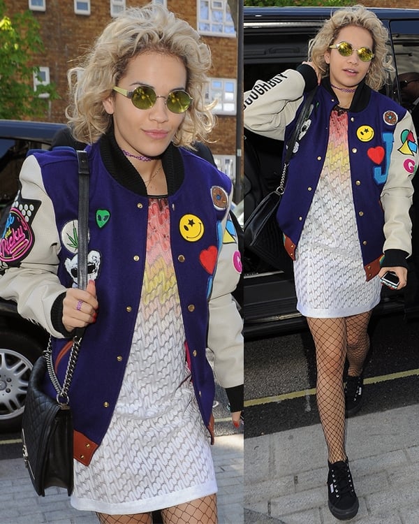 Rita Ora rocked another edgy androgynous style by wearing a varsity jacket, seemingly from a men’s line, over a Missoni ombre knit dress.