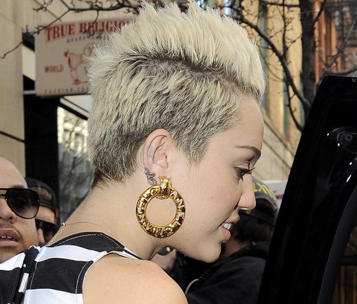 Miley Cyrus showed off her Chanel cut-out circle earrings after attending a fashion show in New York.