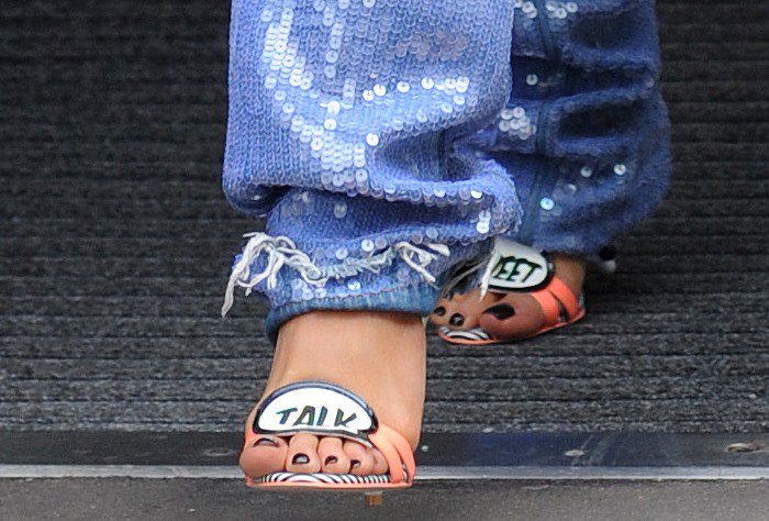 Rita Ora’s sandals featured monochrome stripes and beaded heels, along with playful speech bubble embellishments that read “Sweet” and “Talk,” complemented by pastel-colored straps. Although this specific style is no longer available online, the latest Sophia Webster designs can be found at retailers such as Farfetch.