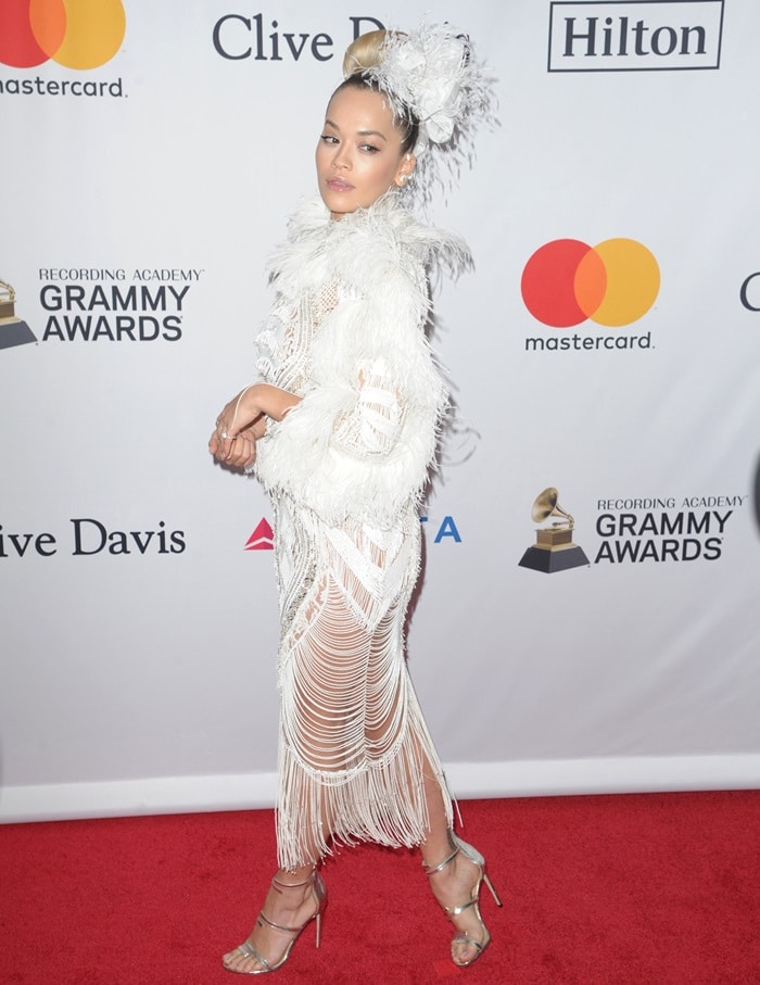 Rita Ora stuns at Clive Davis’ Pre-Grammy Gala in a beaded, feathered Zuhair Murad Fall 2017 Couture dress, complemented by a sleek updo adorned with a feathered headpiece