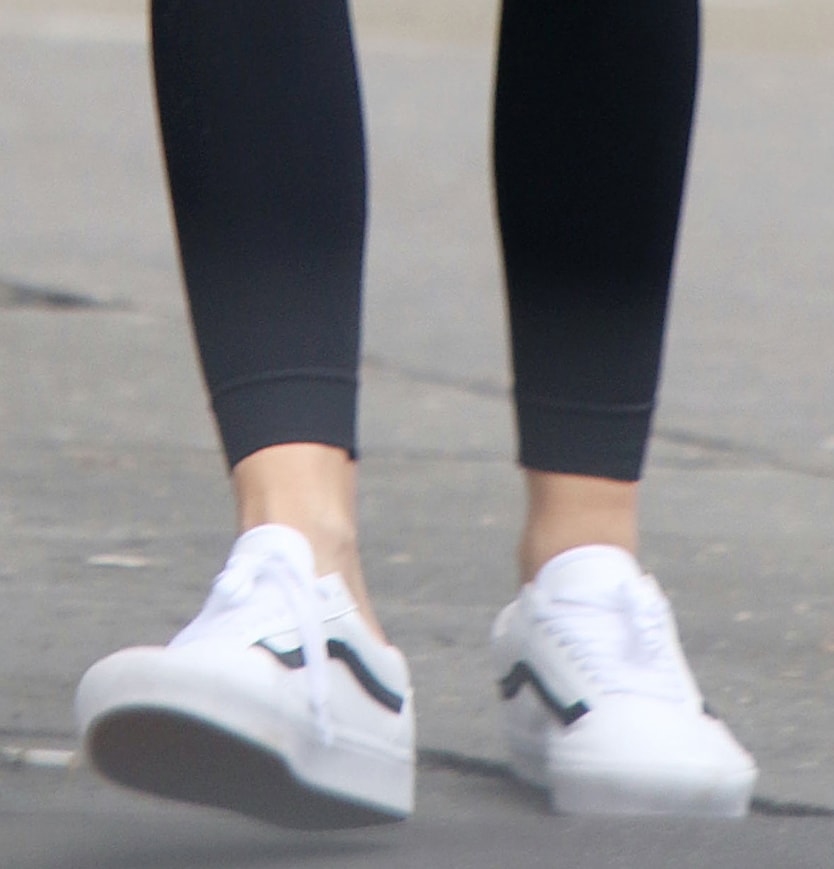 A pair of Vans Old Skool shoes rounded out Emily’s relaxed getup. Available in several colorways, these classic skate shoes feature a low-profile silhouette with a padded collar and cotton drill lining.
