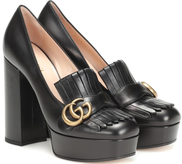Kiltie fringing and burnished metal GG emblems – drawn from the house’s ’70s archives – make black leather platform pumps with chunky block heels strong conversation starters.