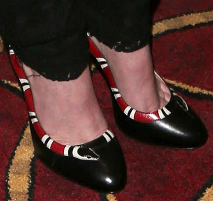 Rumer wore a lace jumpsuit from Monique Lhuillier and the ‘Yoko’ snake pumps from Gucci. The kingsnake had quickly become one of Alessandro Michele’s most recognizable symbols after his appointment as Gucci’s creative director in January 2015.