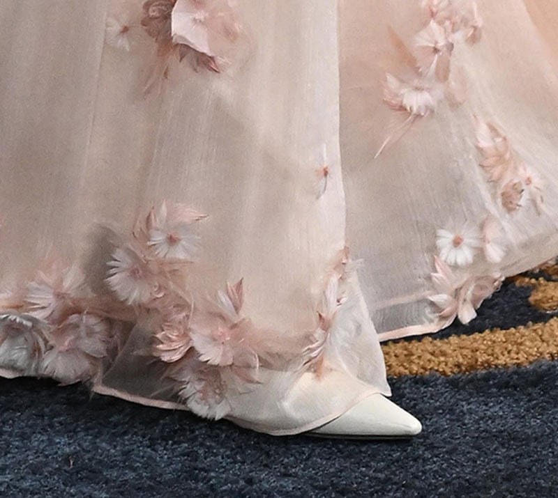 It’s cut from pale pink fabric and adorned with intricate 3D floral appliques crafted from feathers. These appliques give the dress a dreamy, ethereal look that feels like it was pulled straight from the pages of a fairytale.
