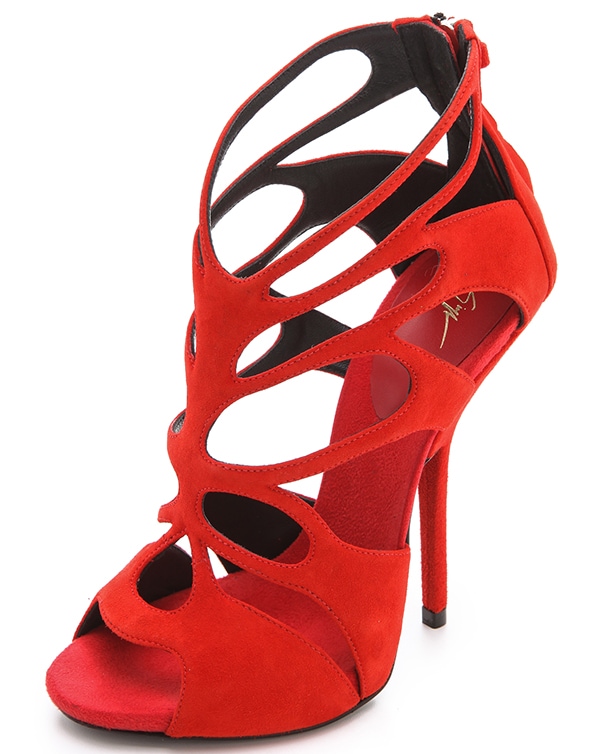 Sally wore Giuseppe Zanotti suede heels featuring artistic and symmetric cutouts that give them a sculptural look. They have about 5-inch heels and 1/2-inch platforms for extra height.