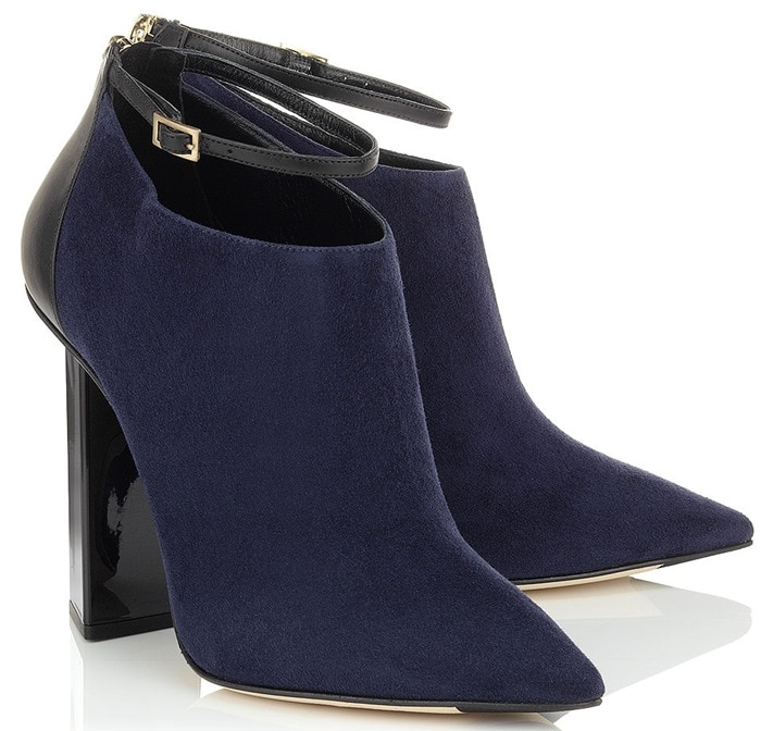 The pointy-toe Vanish booties by Jimmy Choo feature sculpted triangular heels and are handcrafted in a rich duo of textures and tones.