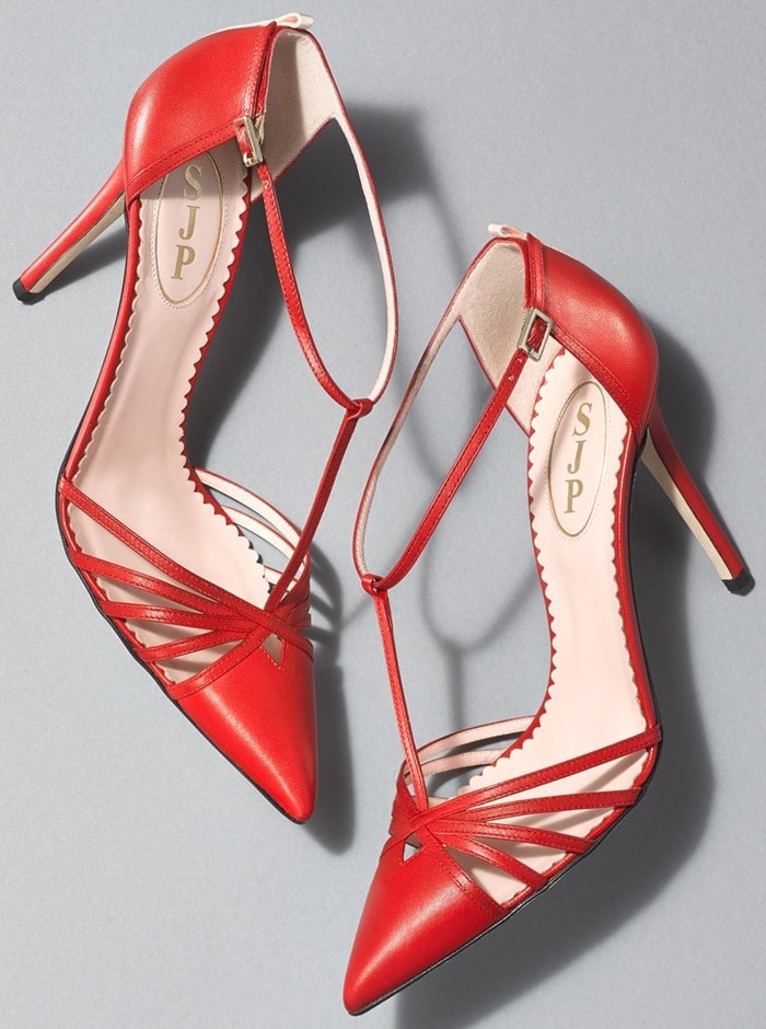 She wore her signature leather pointy-toe pumps featuring delicate grosgrain ribbons, adjustable straps with buckle closures, and elegant t-bars to complete the look. Below, discover some of the most popular colors of the “Carrie” T-strap pumps: