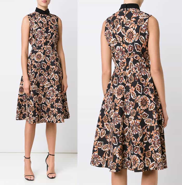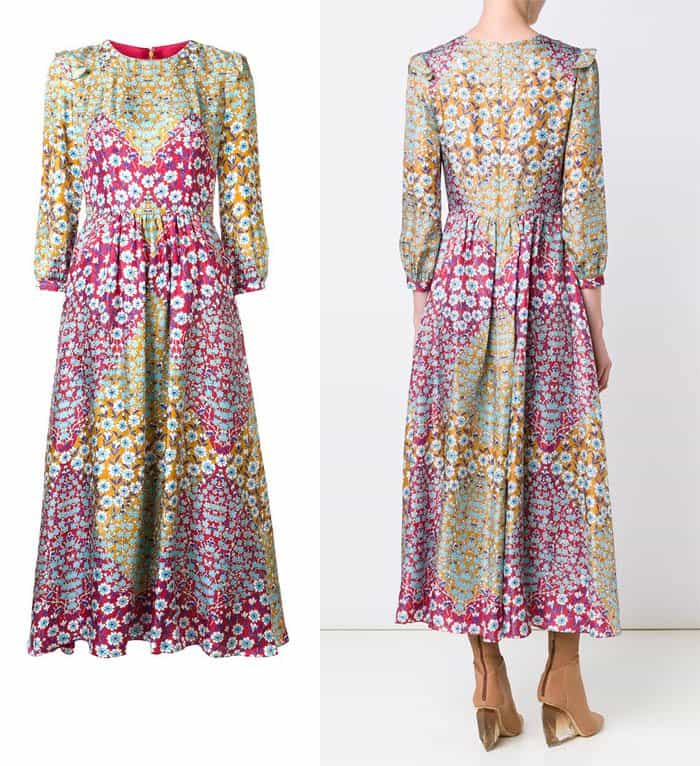 She paired the fit-and-flare midi dress with a pair of SJP by Sarah Jessica Parker “Fawn” satin pumps and a Chloe Faye Wonder Woman medium patchwork suede and leather bag.