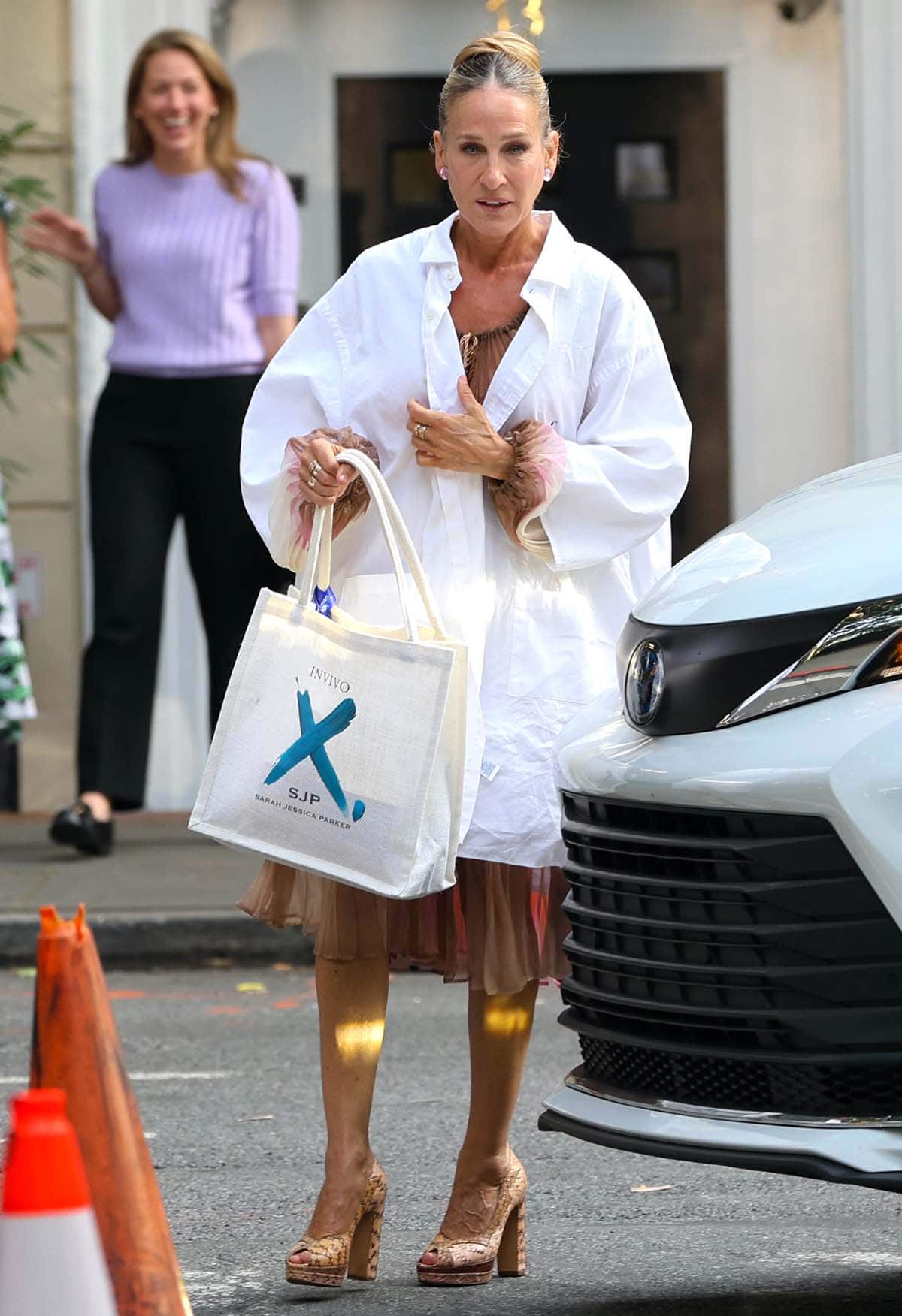 I love how the stylist gave SJP a chic, far-from-boring monochromatic appearance by pairing the shoes with a light beige sheer tulle dress. The exquisite number hails from Simone Rocha’s dreamy Spring 2024 collection, whose signature quirky yet ultra-feminine designs resonate with SJP’s style.