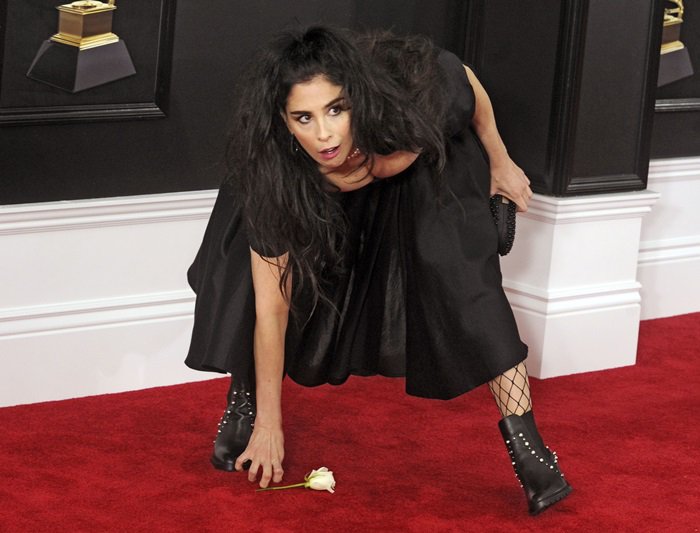 Sarah Silverman’s Bold and Edgy Look at the 2018 Grammy Awards: A Puff-Sleeved LBD and Studded Jimmy Choo Booties