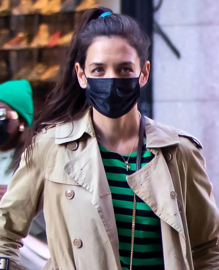 Stepping out bare-faced, Katie’s eyes looked swollen as she kept her nose and mouth covered with a black face mask. She pulled her long tresses up into a high ponytail with a blue hair tie, showing her tiny silver earrings.