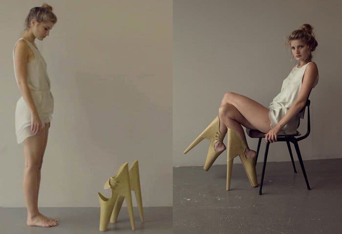Artist Leanie van der Vyver conceptualized these shoes to be worn with the heels in front and the platform at the back. The reversed pitch makes the wearer walk like something straight out of a ‘Silent Hill’ video game or an extra from ‘The Walking Dead’!