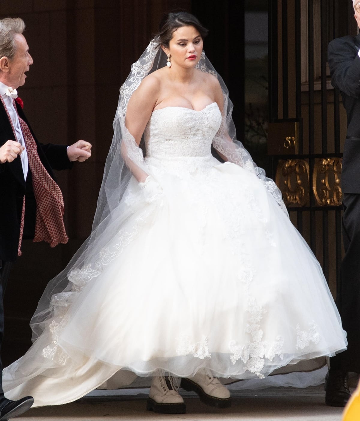 Donning a full, princess-style white wedding dress with a strapless corset bodice, lace details throughout, and a dramatic tulle veil, Selena looked every bit the stunning bride.