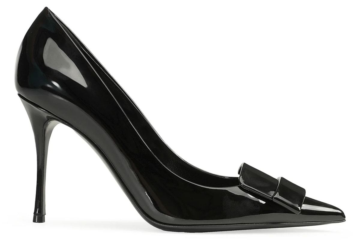 A black patent leather pump is an essential wardrobe staple. See Luna Bijl wearing a sheer red dress and showcasing the SR1 pumps.