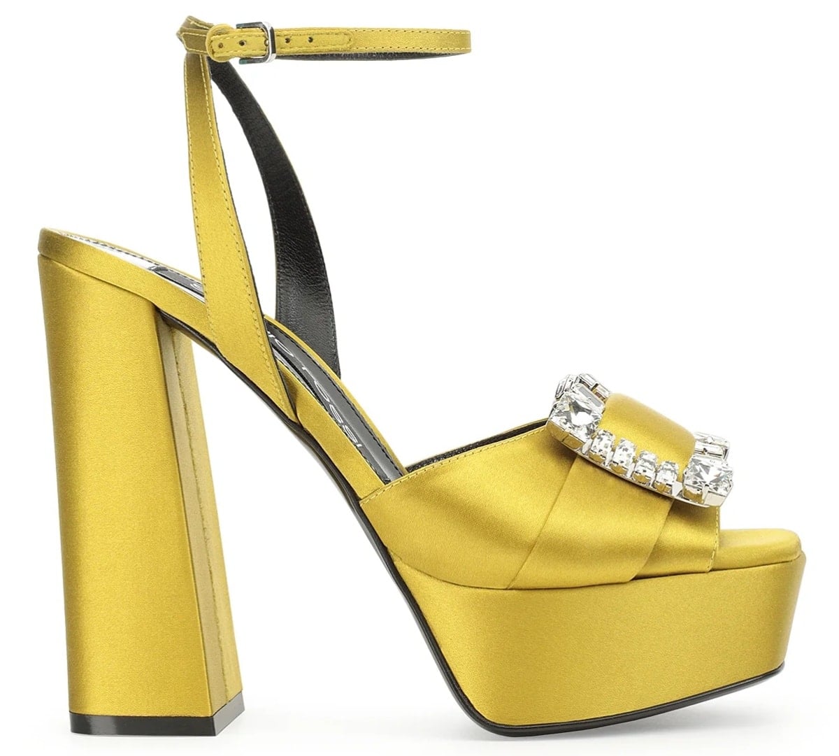 These sandals are crafted from yellow satin and feature high heels, square toes, and rhinestone-dotted straps.