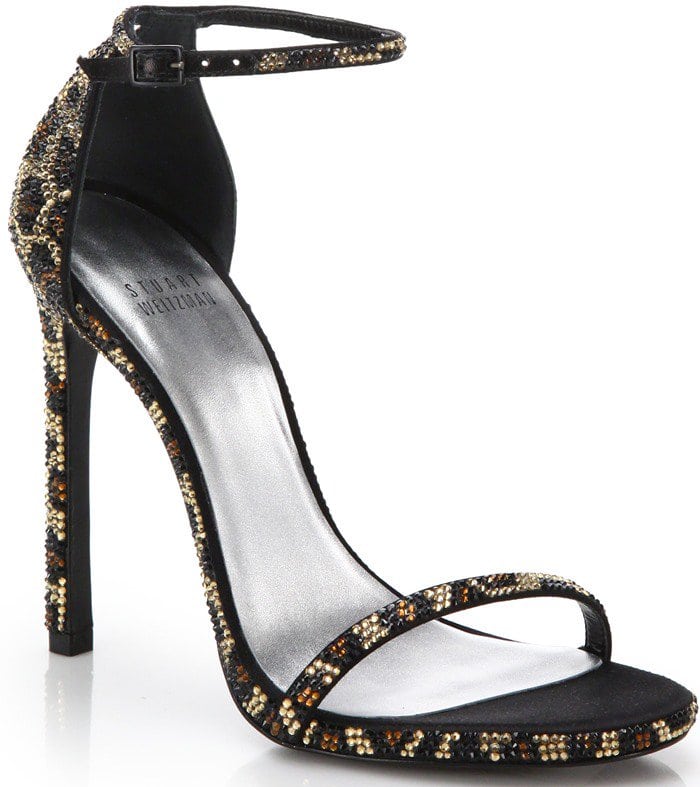 Michelle’s sandals are the updated version of the classic favorite, Stuart Weitzman “Nudist” sandals. These 4.5-inch heels feature all-over crystal embellishments and adjustable ankle straps.