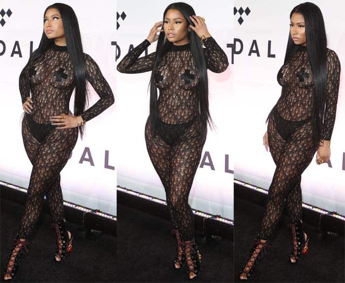 Later that night, the rapper showed off all her assets in a black see-through bodysuit. She covered just the essentials with nipple tape and a black thong. Nicki even shared a sexy video of herself twerking in the outfit on Instagram.