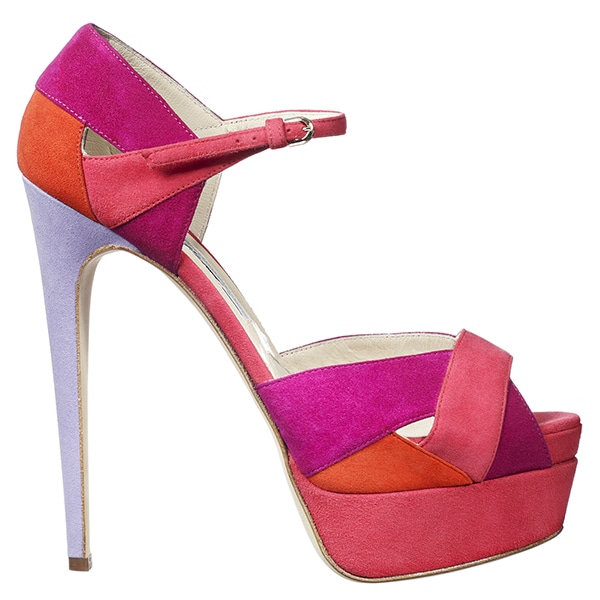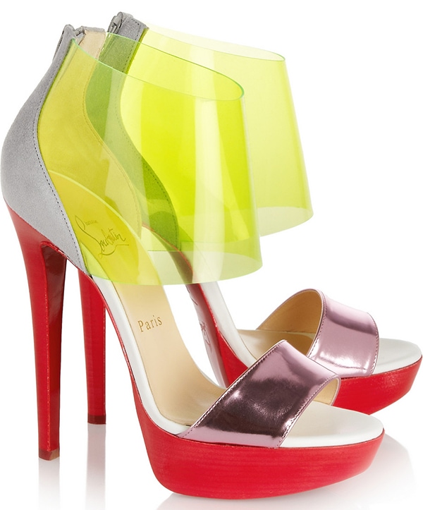 Her “Dufoura” sandals feature transparent neon PVC at the ankles and metallic lilac bands across the toes. The 5.5-inch heels have pale gray suede at the heel counters, and the shoe’s 1.5-inch platforms are trimmed in white.