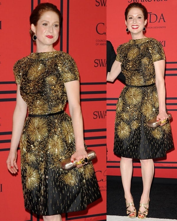 Ellie Kemper looked like a firework in her Naeem Khan Fall 2013 dress. The actress accessorized her black-and-gold beaded dress with black-and-gold earrings and a knuckle clutch, and she finished her look with matching golden heels by Rupert Sanderson.