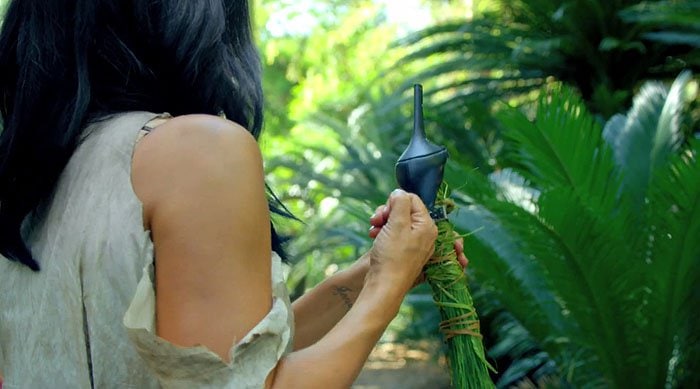 Anyway, we’re not here for that. We’re here for the cute little scene in the video wherein Katy, acclimating to her new jungle surroundings, breaks off a heel from one of her shoes, ties it to the end of a spear, and uses it as a weapon.