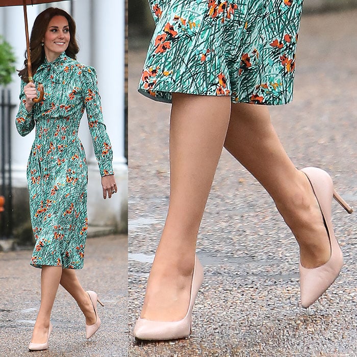 Kate Middleton wearing her favorite nude L.K. Bennett “Fern” pumps during a visit to The Sunken Garden at Kensington Palace in London, England, on August 30, 2017 (Credit: WENN)