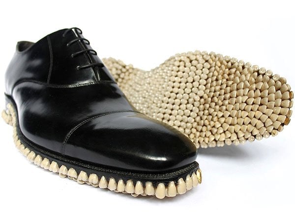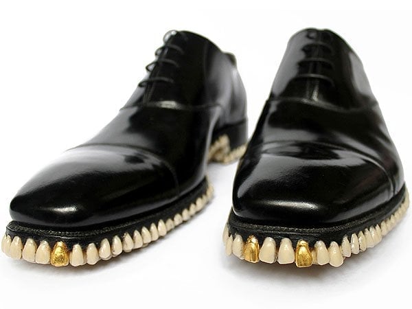 Fantich and Young took a pair of men’s brogues from British footwear brand Baker, glued 1,050 teeth dentures on the soles, and finished them off with two gold teeth at the toes.