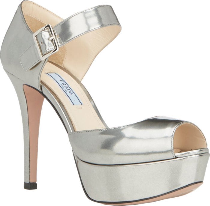 These four-inch heels are made of mirror metallic leather and feature buckled ankle straps and peep toes.