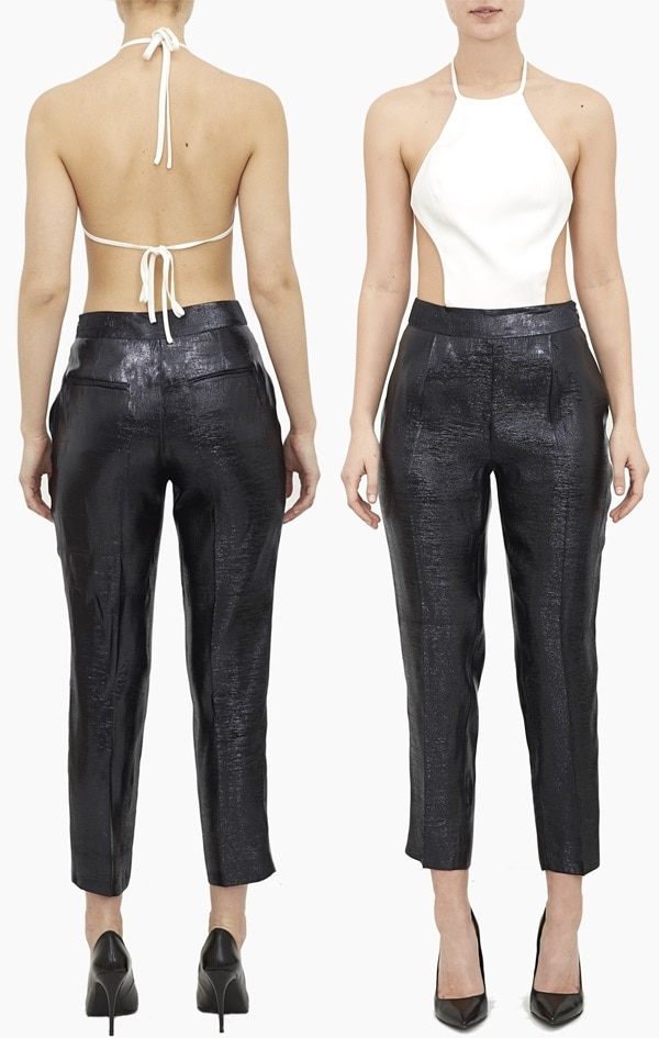 The 18-year-old half-sister of Kim Kardashian flashed side cleavage in a black-and-white jumpsuit by Olcay Gulsen that features slack bottoms, back pockets, a racer front top, an open back with tie strings, and a side zipper closure.