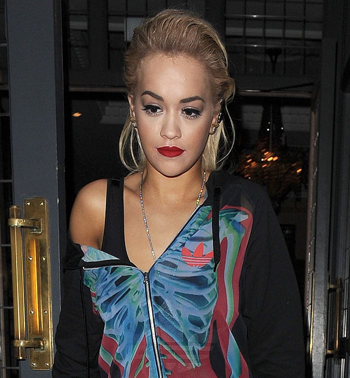 Rita Ora’s blonde hair was slicked back