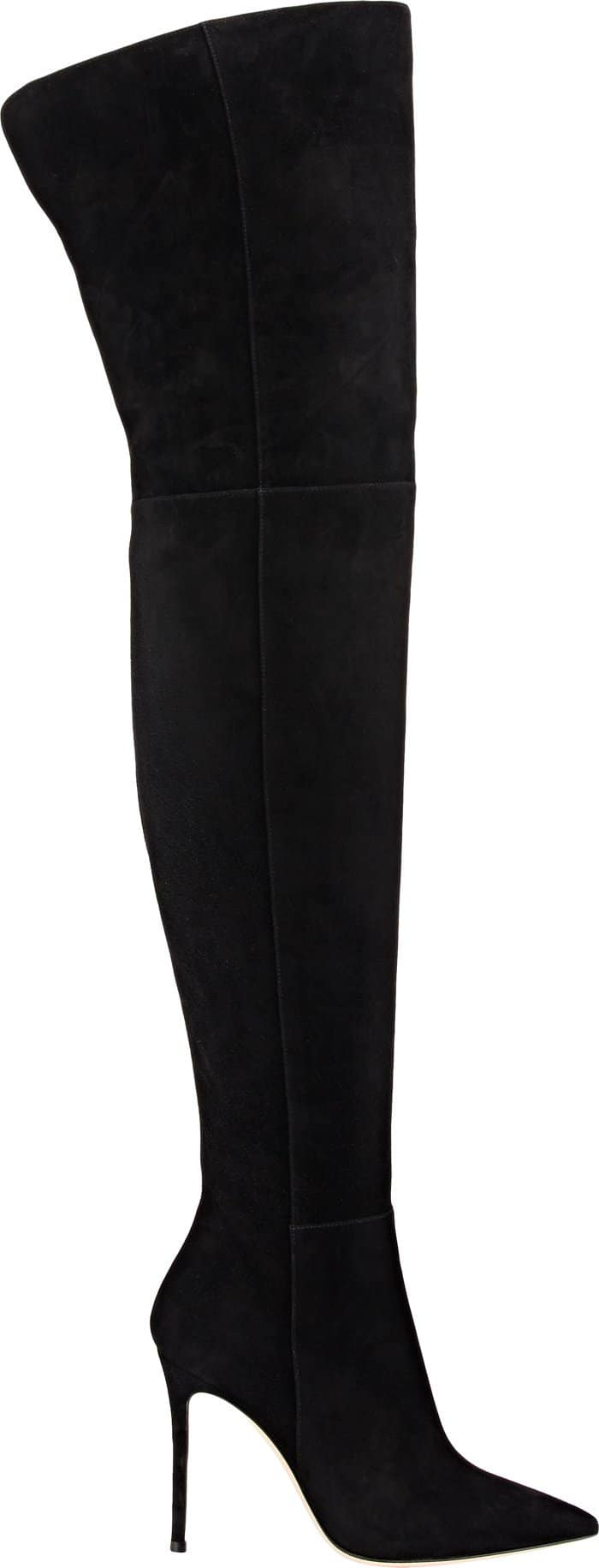Her Gianvito Rossi over-the-knee suede boots feature pointed toes, concealed side zip closures, and covered stiletto heels.