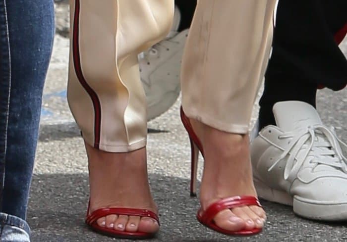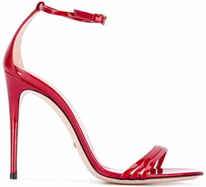 The television personality and businesswoman punctuated her look with red Gucci sandals. Her open-toed shoes feature glossy patent leather, slender straps, and high stiletto heels.