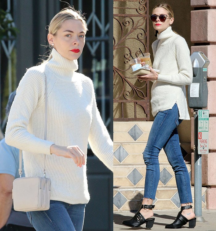 Jaime kept her styling easy and elevated, pairing the edgy booties with a cream turtleneck knit sweater and cropped skinny jeans from Mother — an outfit that still feels just as relevant in 2025 as it did in 2015.