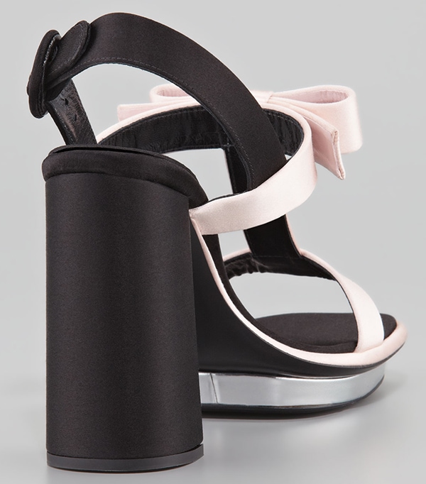 Like her outfit, Solange’s heels are also from Prada’s Spring 2013 collection. The pink satin T-strap design, complete with charming bows, black adjustable slingback straps, metallic island platforms, and 4.5-inch chunky heels, perfectly echoed the playful yet polished tone of her look.