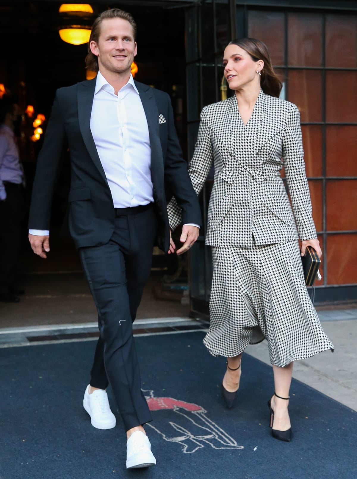 Sophia accessorized the look with a few bracelets, a pair of inverted triangle earrings by Ilana Ariel, and a pair of nude sandals by Stuart Weitzman.