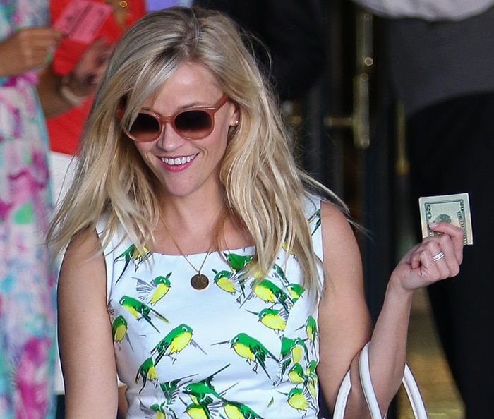 Reese Witherspoon sported a little green dress while attending Molly Sims‘ baby shower at the London Hotel on Saturday in West Hollywood.