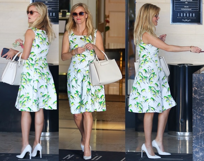 How do you like Reese’s sleeveless A-line dress? Her pointy-toe stiletto heels have unfortunately sold out at Farfetch, but you can find them in other colors at Nordstrom and Saks.