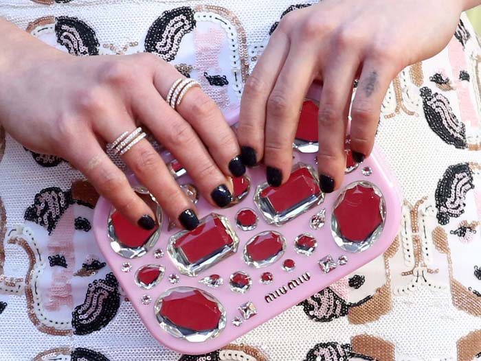 Emilia wore a sequined graphic print ankle-length dress which she paired with a fun embellished clutch — both by Miu Miu.