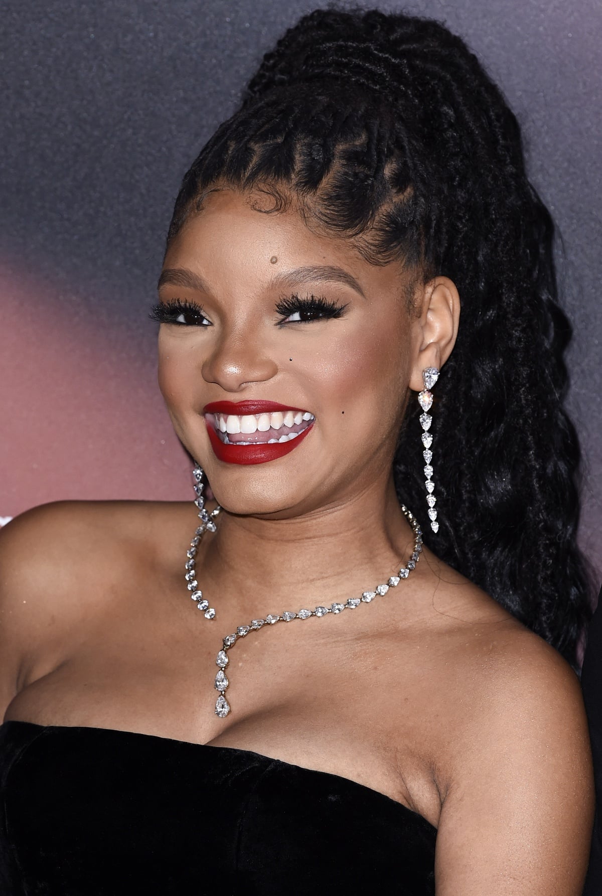 To round off her look, The Little Mermaid star adorned herself with high-shine silver Anabela Chan jewelry, including a diamond collar necklace and dangling earrings.