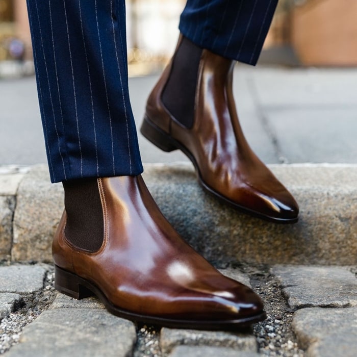 If you want to create a business casual outfit, try to choose a pair of Chelsea boots in the same color family as your suit. You can also never go wrong with black patent leather boots.