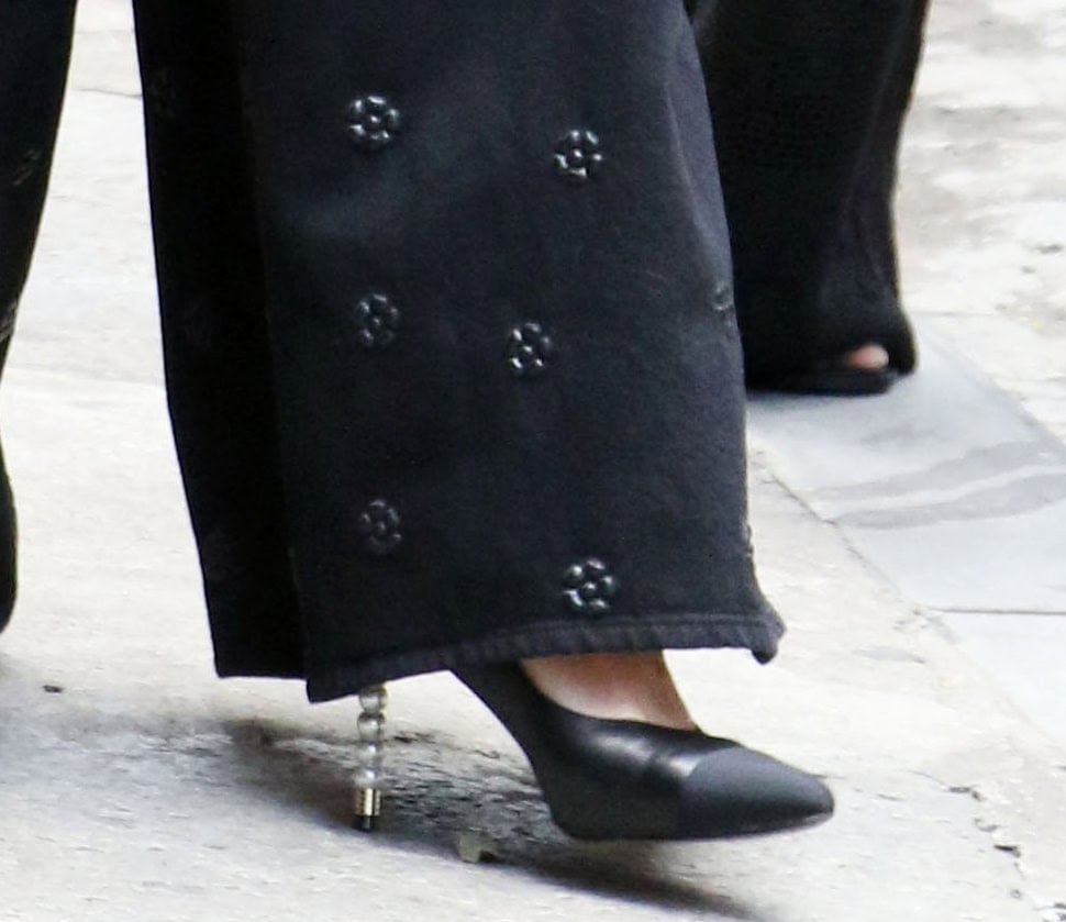 I think the focal point of the ensemble is her shoes. Cut from black leather with canvas pointed-toe caps, these traditional shoes are elevated on 3.5-inch stiletto heels embellished with a single fake pearl.