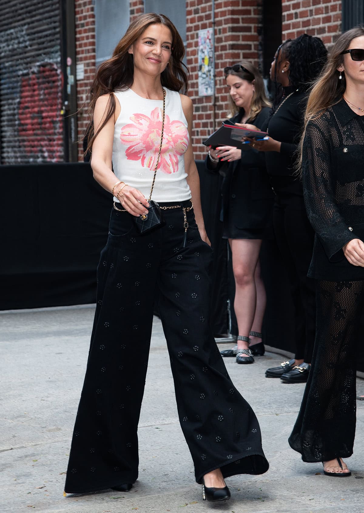 She exuded a relaxed vibe in a fitted white tank top with a large pink flower print on the center front and black high-waisted, wide-leg jeans embellished with small tonal floral decorations.