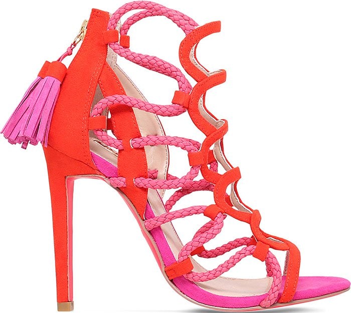 These caged suede sandals feature lattice roped straps, back zip fastenings with tassel pulls, open toes, and four-inch stiletto heels.