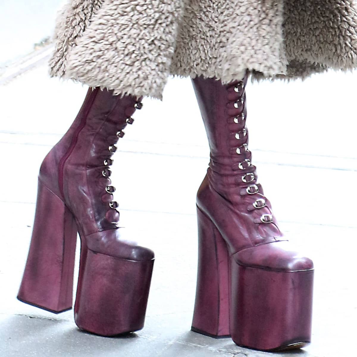These statement-making shoes had an 8-inch heel and a relatively high platform, making them a bold choice for anyone. The pumps also had elaborate straps extending up the shaft, adding an edgy touch to the fierce outfit.