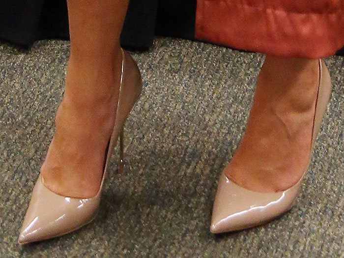 She accessorized with jewelry from Le Vian and finished her ensemble with a pair of Kurt Geiger “Britton” pumps.