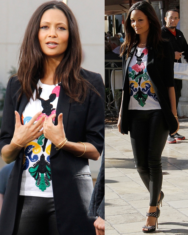 Thandie ditched the dresses for an appearance on “Extra,” opting instead for a colorful business-chic ensemble.