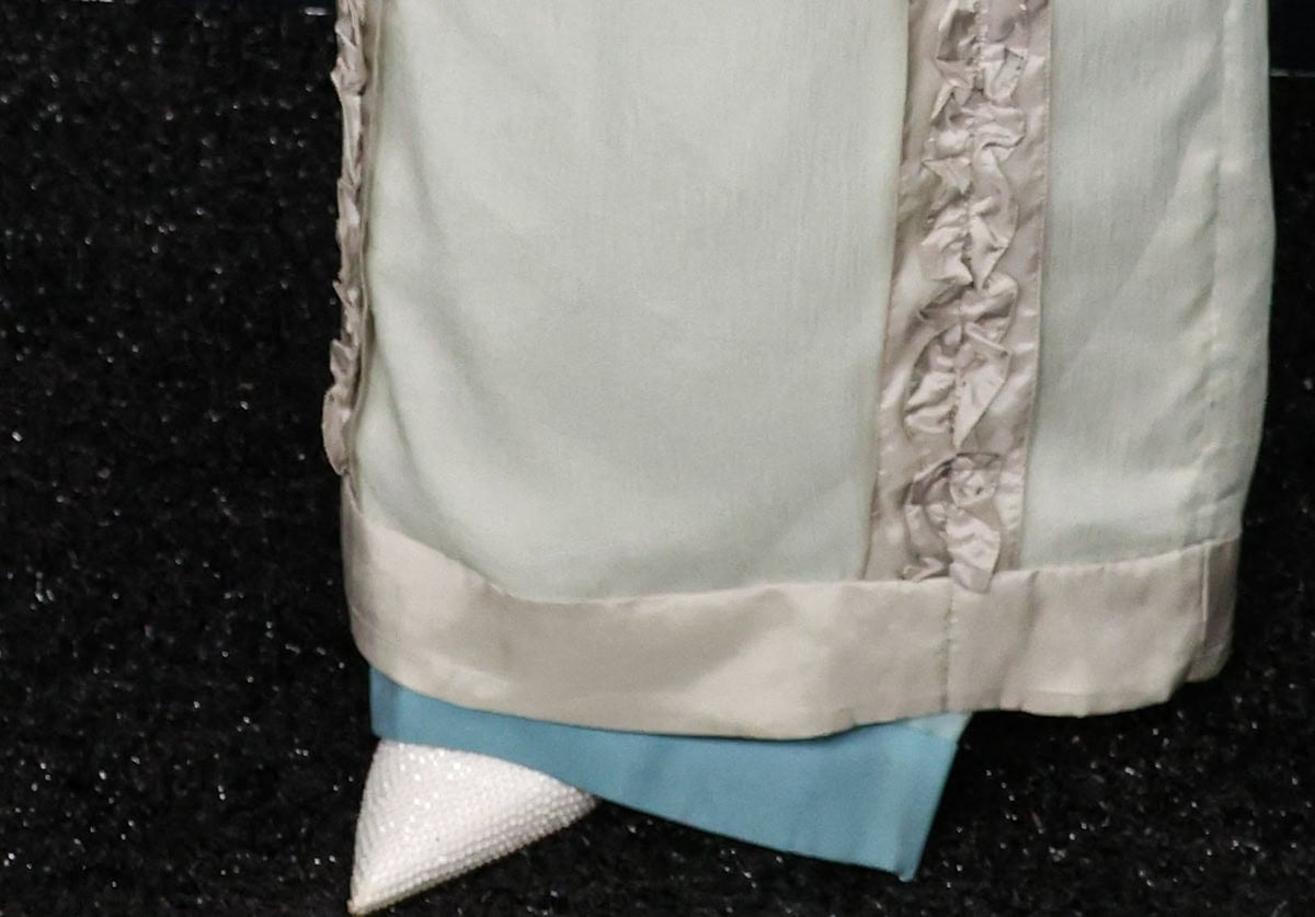 The slip-style dress is a testament to her love of pastels. It’s cut from teal satin and has a corset bodice with mesh inserts on the midsection, revealing her abs and the garment’s boning. From the rear, it resembles a strapless gown tied at the back and layered over a black bralette with white trims and thin spaghetti straps.