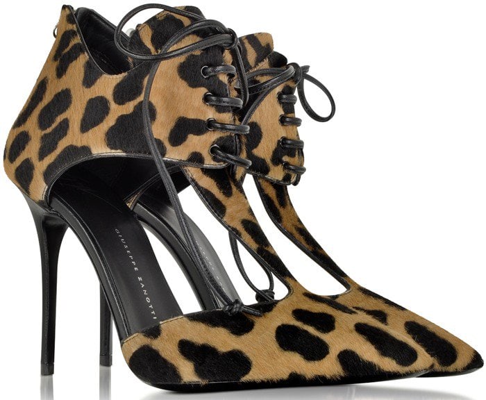 These four-inch stiletto. heels are made of a leopard-print haircalf material, and feature t-straps, lace-up fastenings, pointed toes and back zip fastenings.