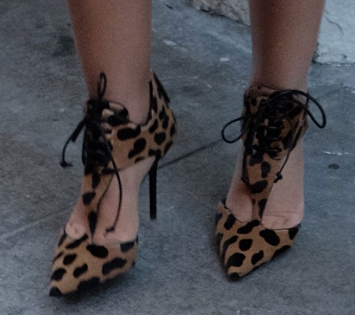 She wore a long vest coat over a black dress that featured a sheer lace skirt, and styled the busy ensemble with an oversized gold clutch, a pair of large sunglasses and a pair of leopard-print pumps.