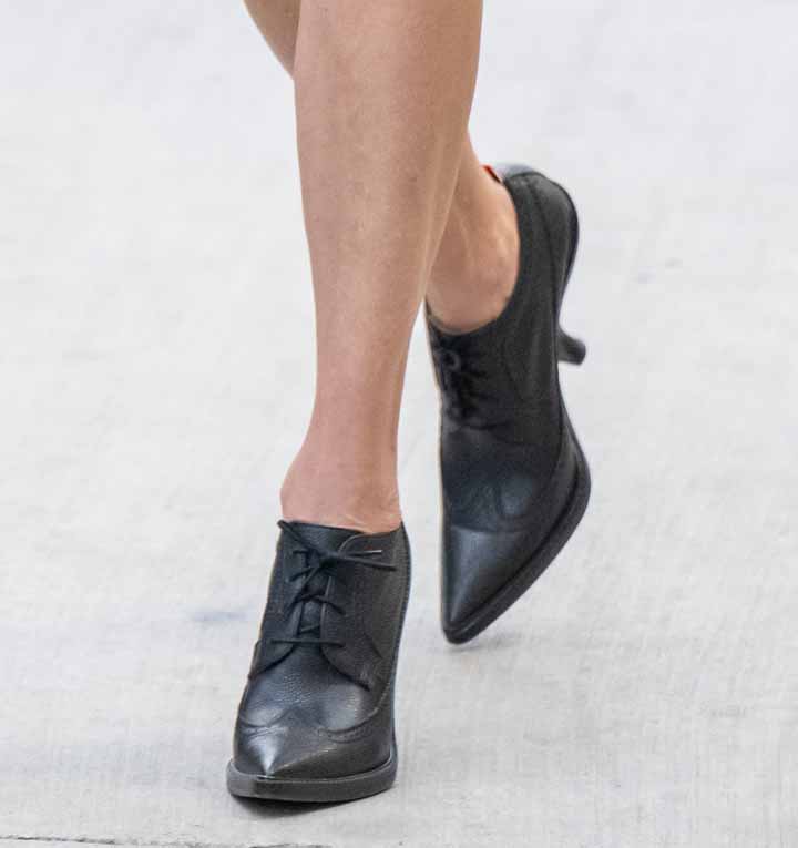 Completing the androgynous-chic ensemble was a pair of brogue pumps by Thom Browne. Her $990 shoes are made of black pebbled grain leather and feature a lace-up closure, pointed toes, perforations, curved heels, and the American fashion designer’s signature grosgrain loop tab.